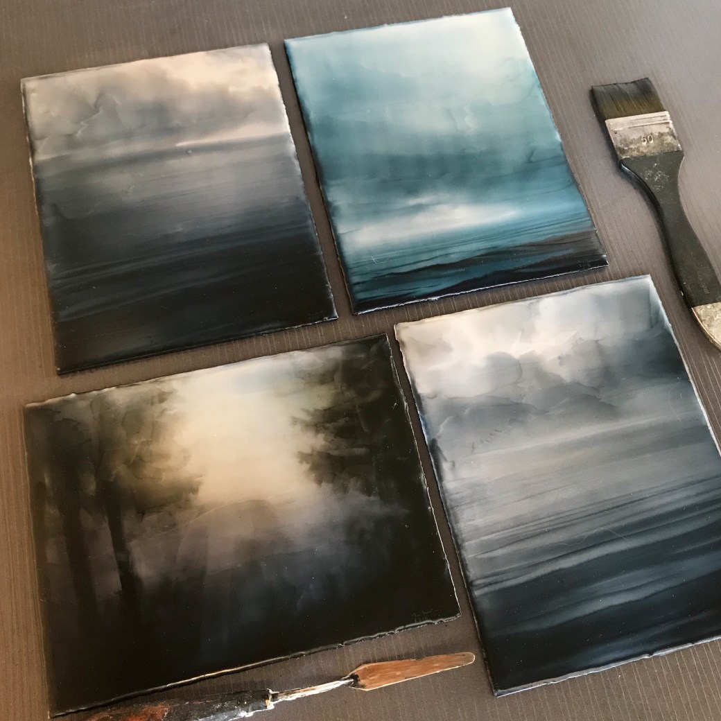 These four small paintings are acrylic on panel. I finally varnished and signed them so I can mail them to a buyer today!