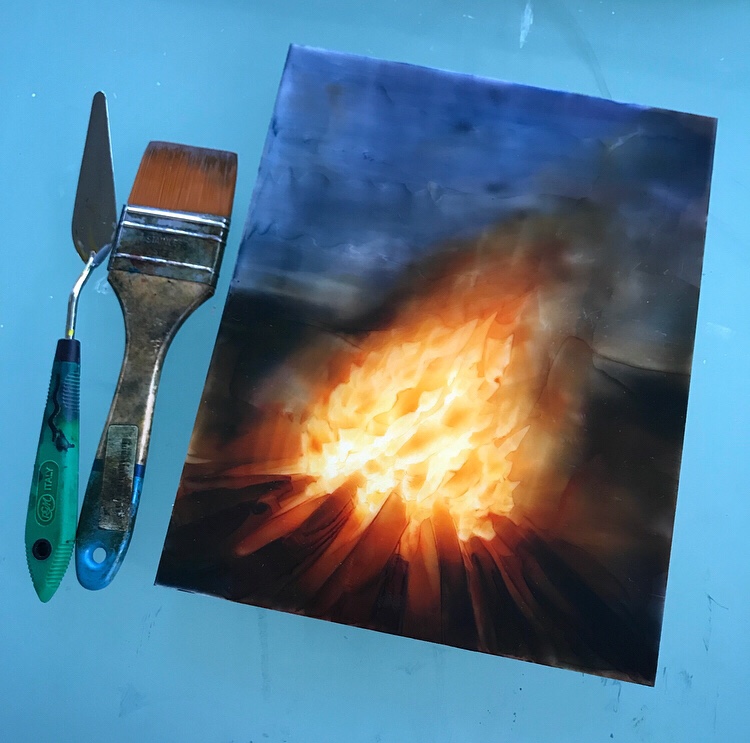 A small fire painting, 8″x10″. Fire like water has a fascinating quality that really holds my attention. The hypnotic motion and the timeless nature of elements, I suppose, are part of their appeal.