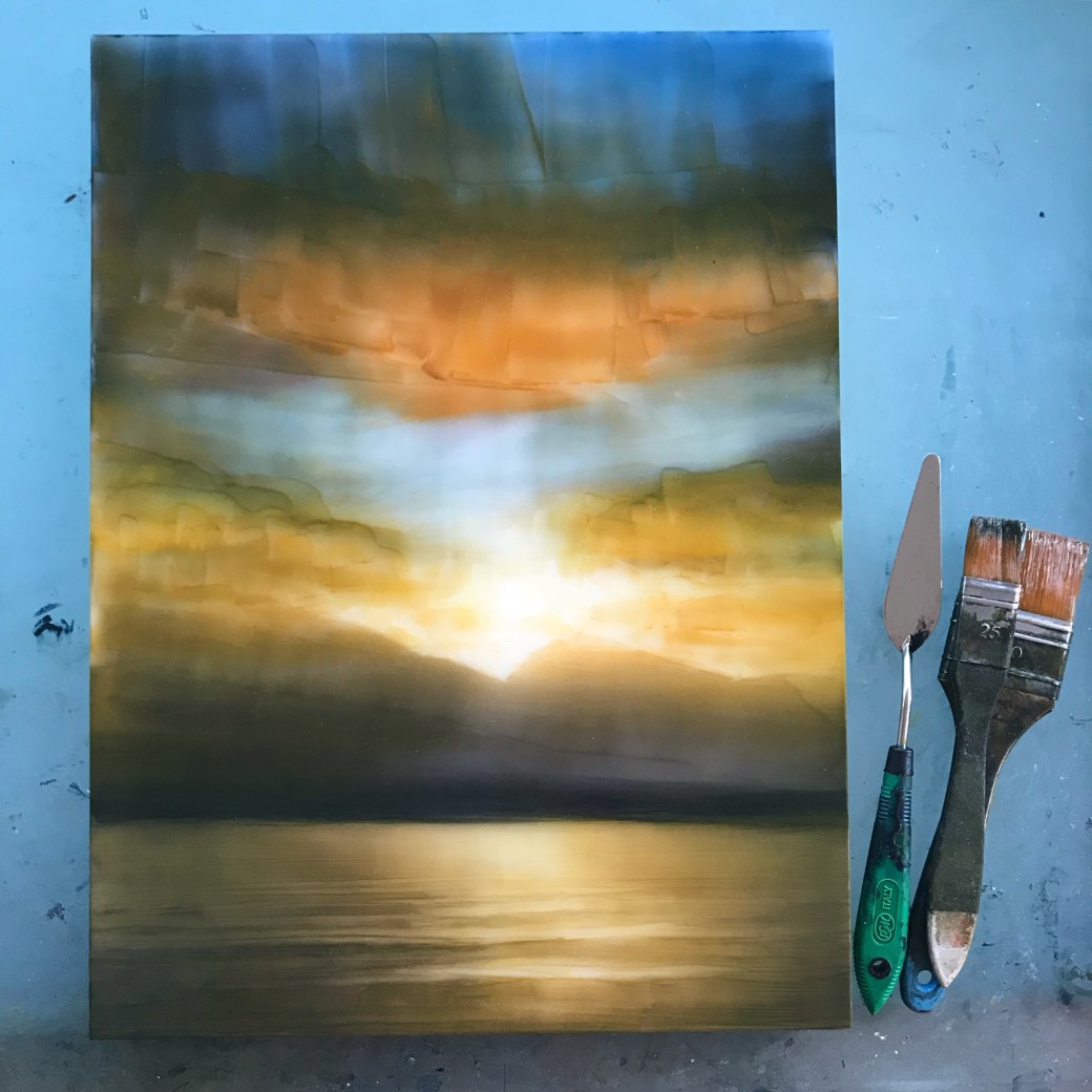 This painting is mostly about the light. It does also have a regionally famous peak as its namesake. This lovely mountain is east of where I live in North Idaho. I can see the peak when I am out on Lake Pend Oreille.