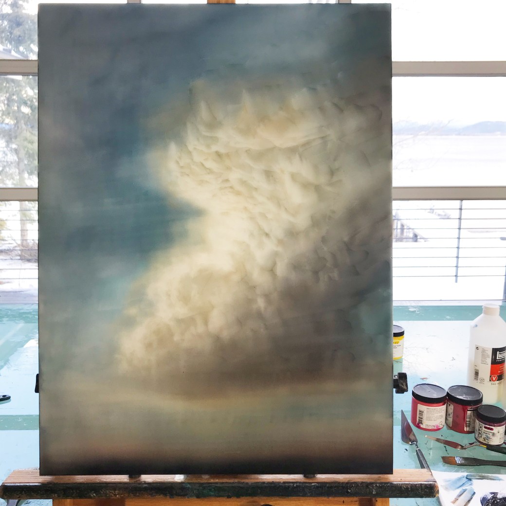 It struck me when I walked into my studio this morning that my current painting feels very much like a ghost. I have it on my table easel and it seems to hover on the table.