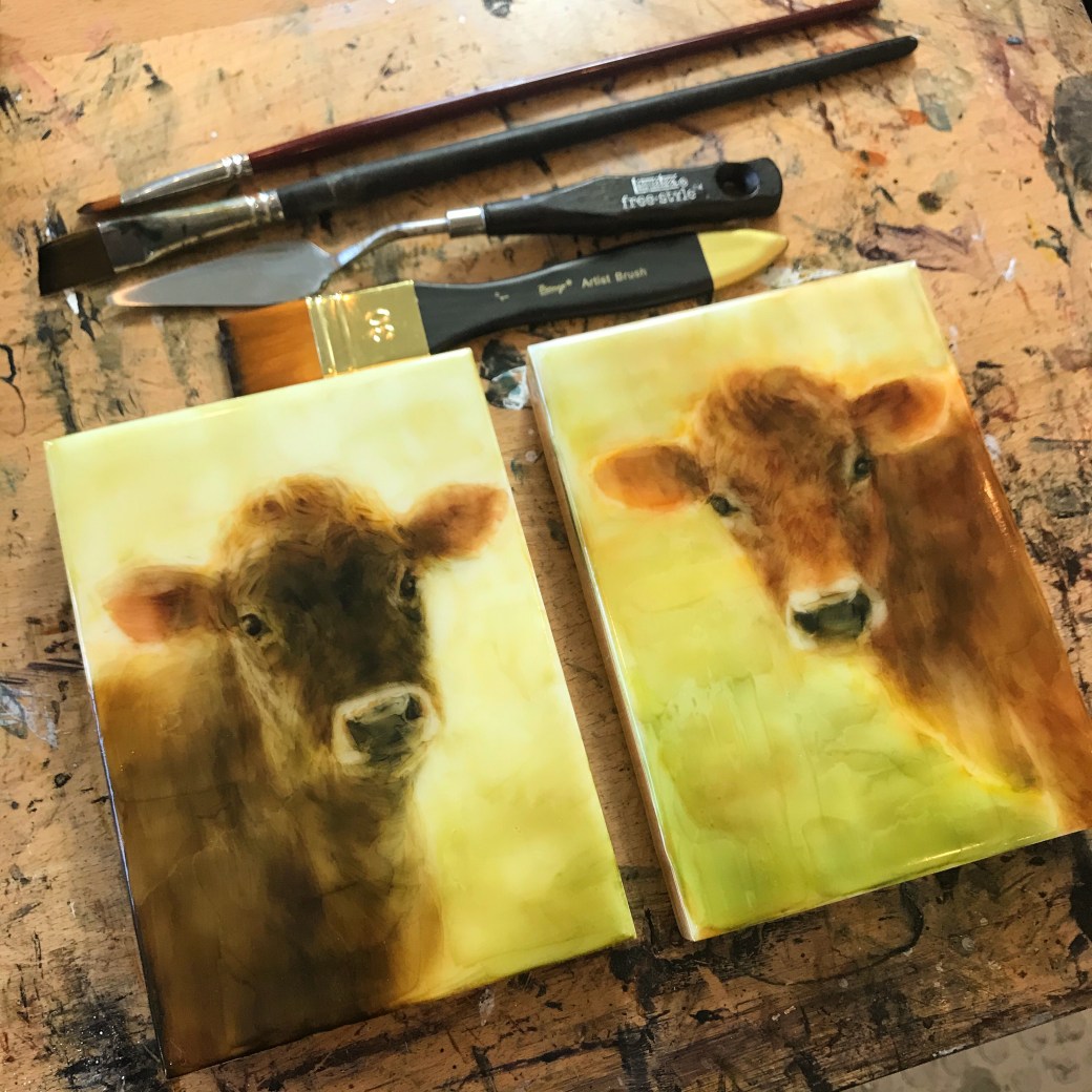 My two finished cow portraits. Today I am shipping them to the little pink house gallery for a Fall show. The LPHG is a small gallery in North Idaho. I usually send them paintings a couple times per year. This LPHG and Radius Gallery in Missoula, Montana are the closest galleries I work with.