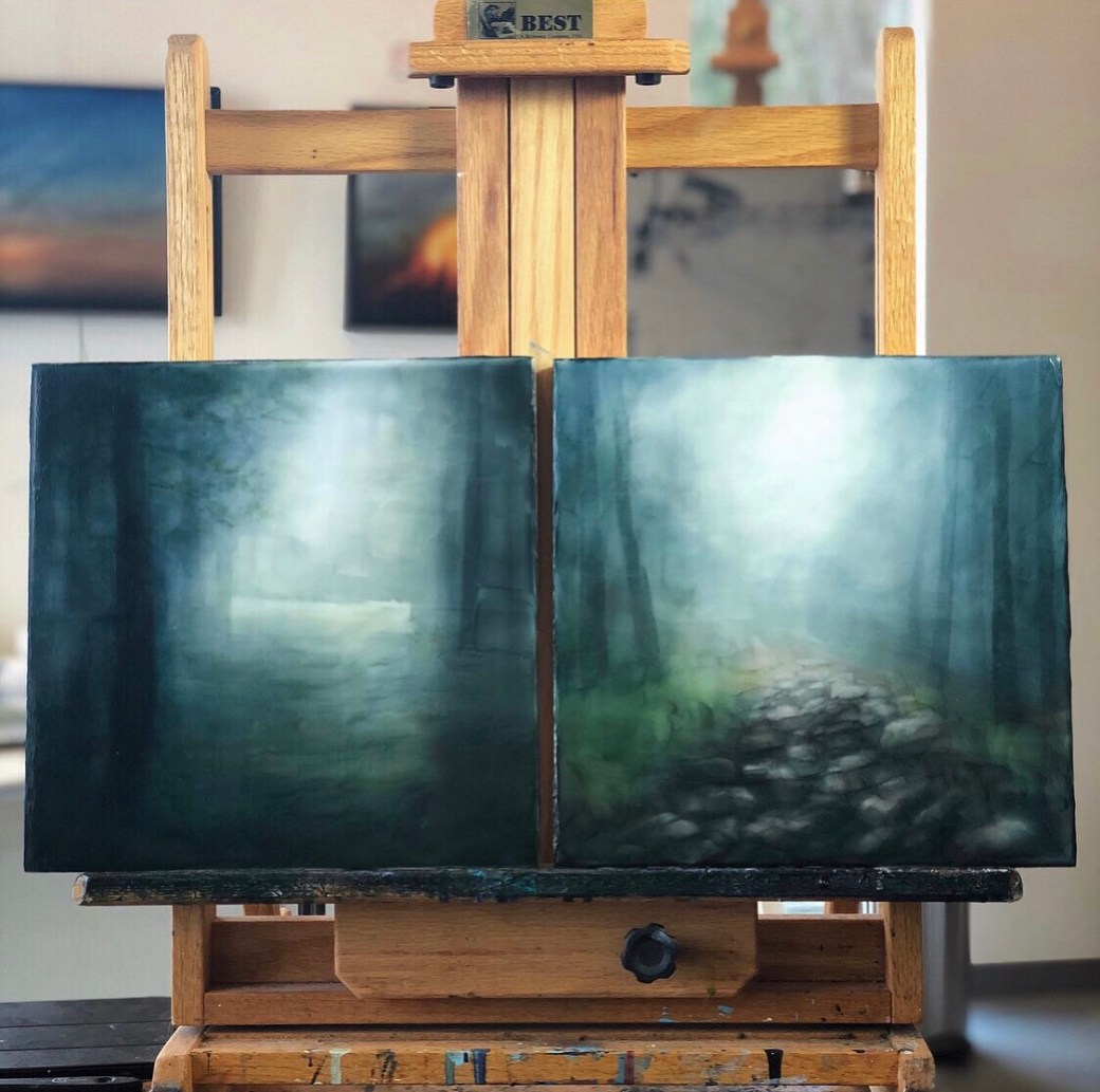Two moody forest scenes. I prepared so many 12” boards that I keep painting images this size! It is a fun scale to work on as it allows for a little quicker experimentation. Ultimately I need to move back to larger panels for my 2020 exhibits.