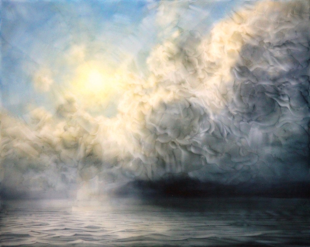First, I see the two circles in the clouds, then the sun, then the reflection of light and, finally, the dark mountains. Lots of movement in those clouds.