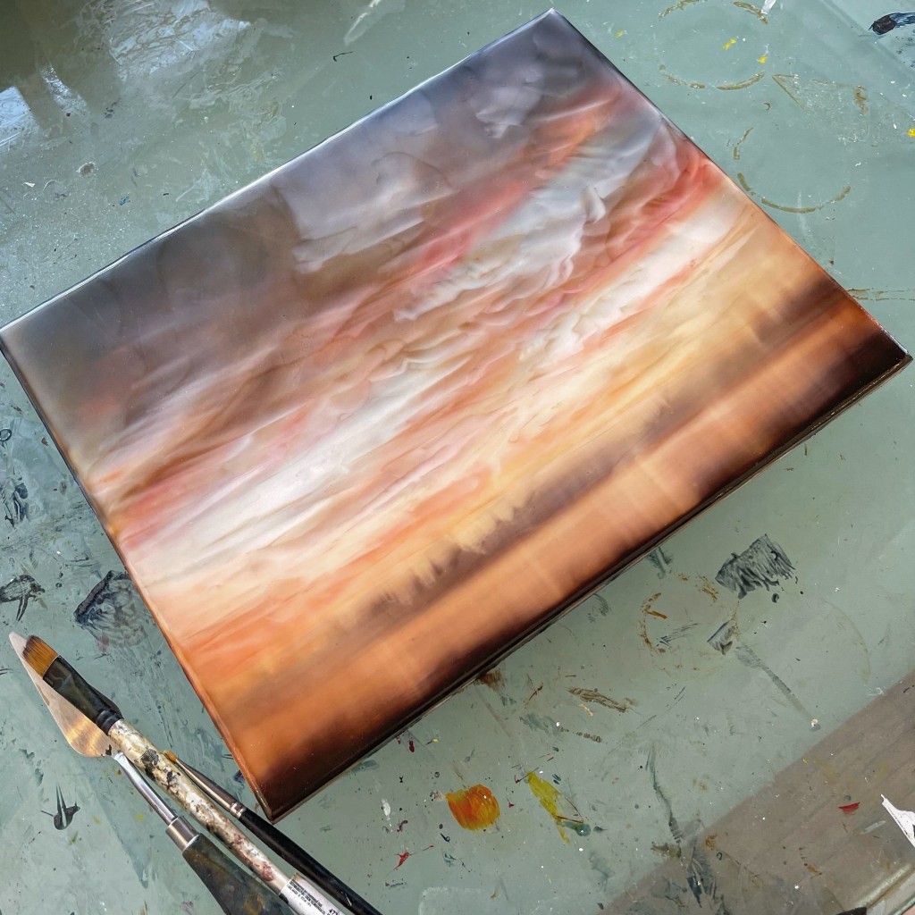 This morning I put the finishing touches on this small painting. I have a number of boards this unusual size. I will have to order custom floater frames when the time comes.