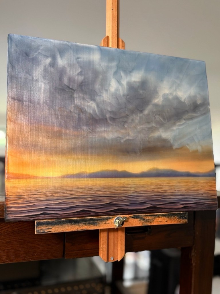 A new painting in the studio today. This piece is a love letter to light and atmosphere. A few images from the easel.