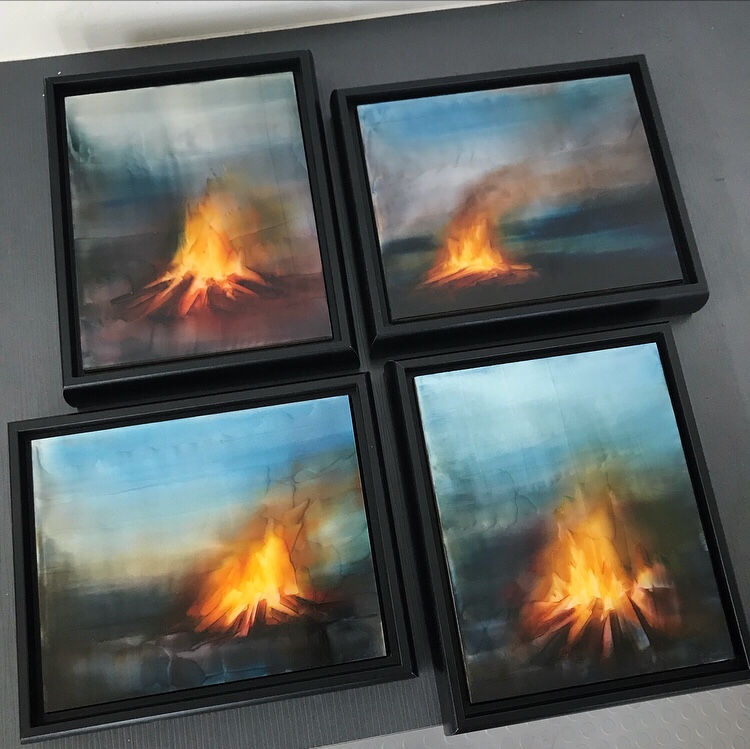 My collection of four campfire paintings. I sold one of these and thought I better get a “family” photo of them before I mail off the purchased piece. These paintings are all 8″x10″ plus the dimensions of the floating frames.