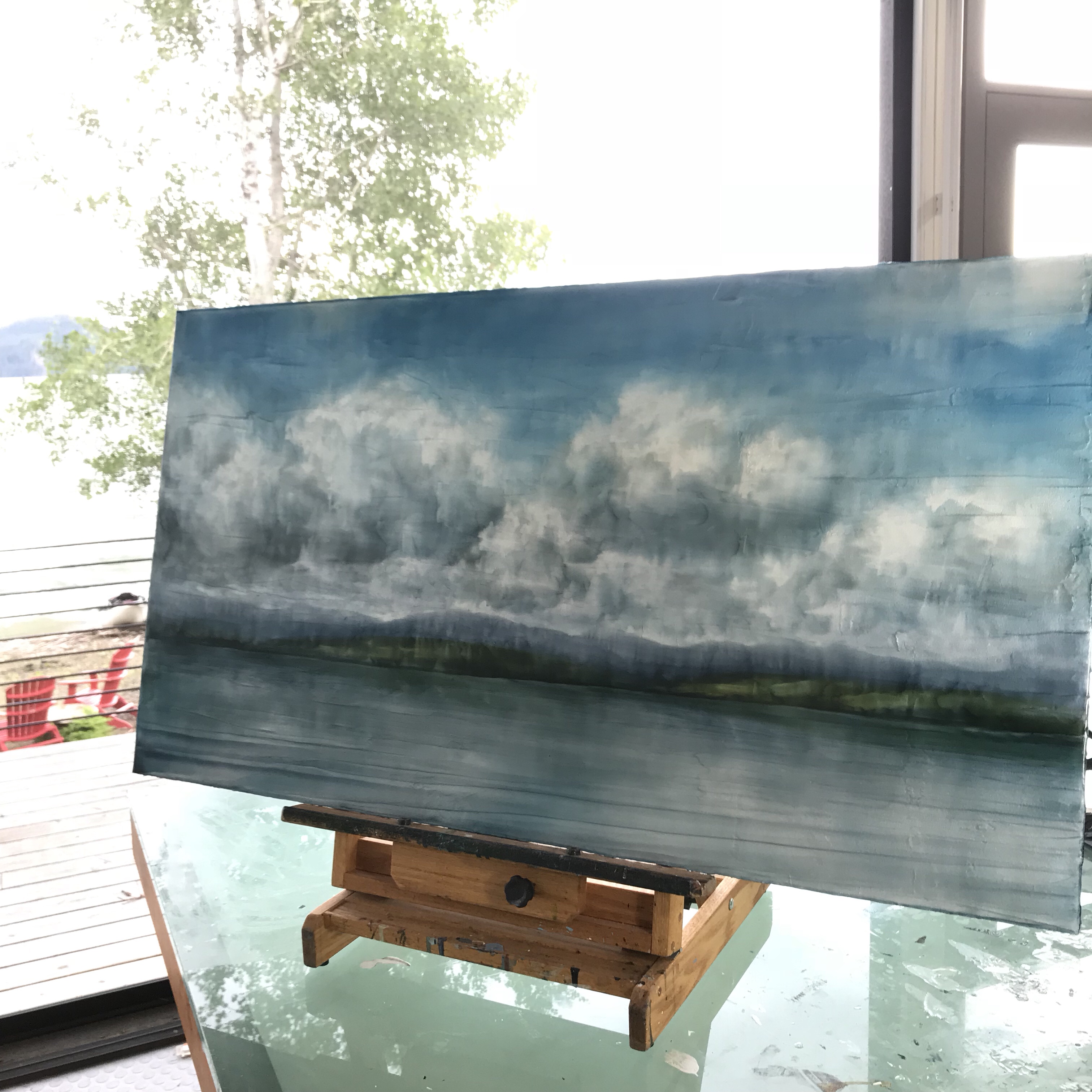 The painting is 60″x22″ on a 3″ cradled board, so it is heavy. It is also surprisingly difficult to get a photograph of something this size without reflections or lighting issues. I ran out of time and simply had my Dad take a photo of me holding it!