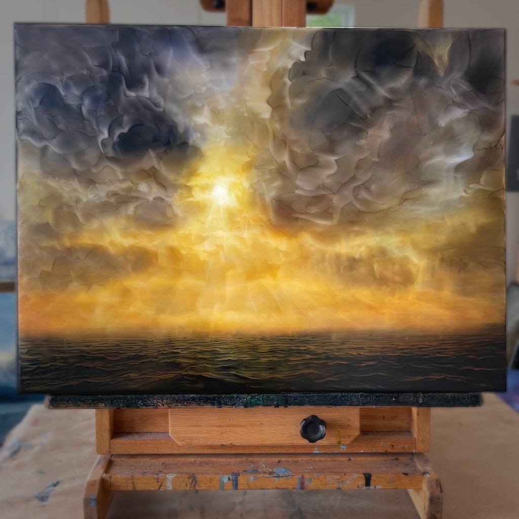A new winter scene on the studio easel. I love nature, it is a constant source of inspiration and joy. I tend to use nature as a jumping off point. My paintings tend to be fantastical dreamscapes, this is a good example. The paint is also the subject, I obsess over paint blending and mark making.