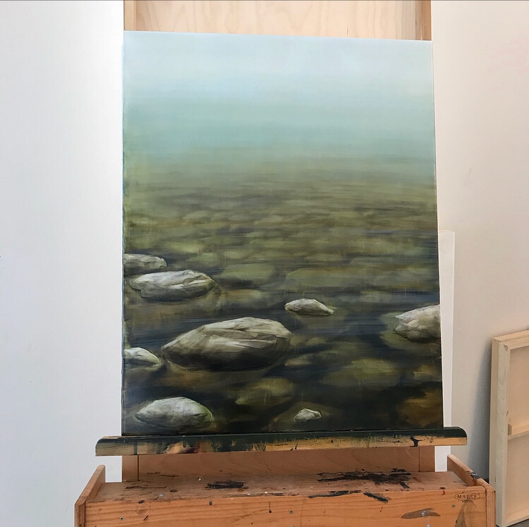 I have been working on a few of these large (24″x30″) shoreline paintings. This is one of them that is possibly finished.