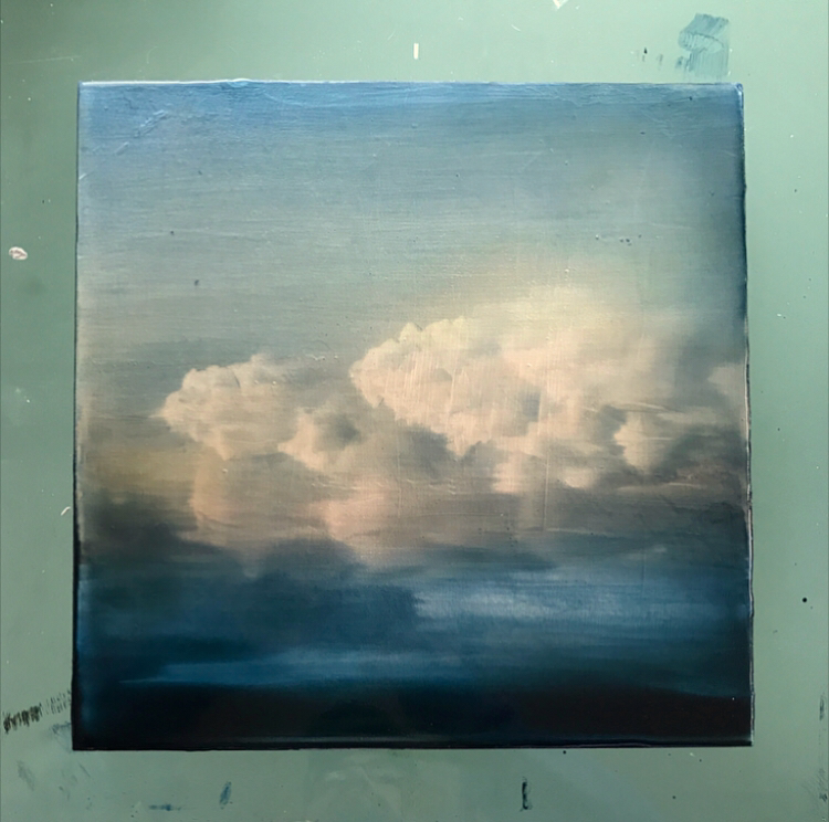 Once again I find myself obsessed with clouds and skies. This painting kept changing and restarting. I probably destroyed 2 perfectly good works before finding my way here. Unusual colors and lighting won me over in the end!