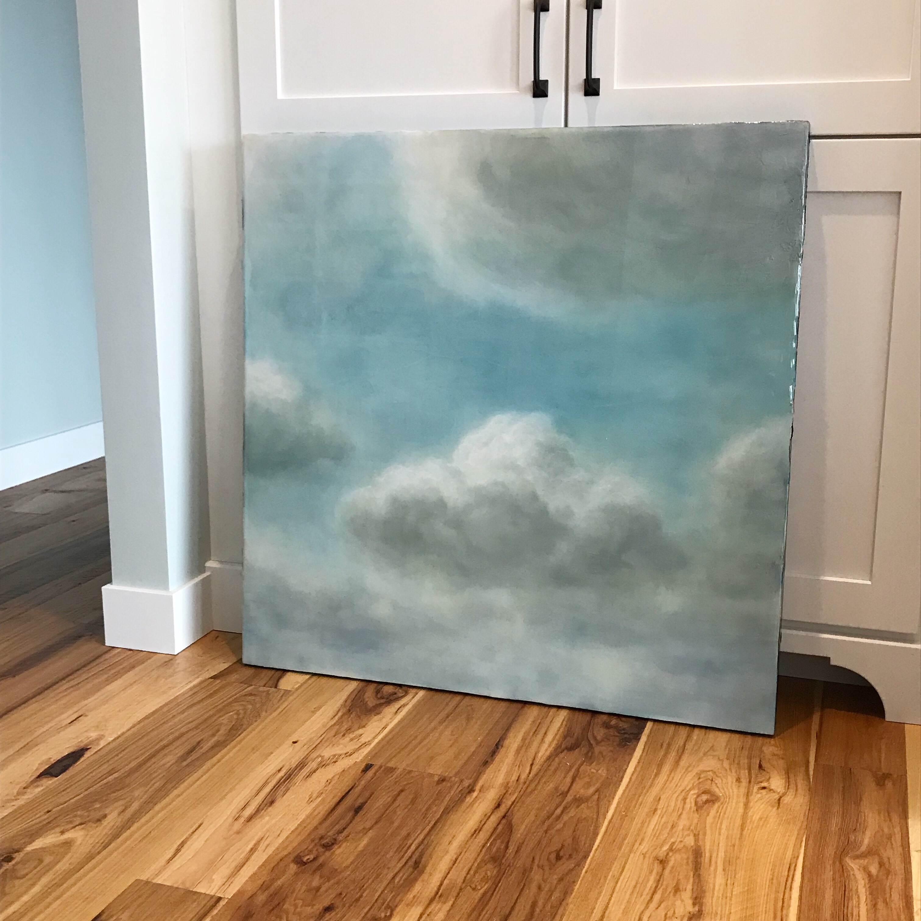 I am wrapping up this 36″x36″ cloud painting I did on commission. I realized it looks pretty good in my living room! It is off to California regardless.