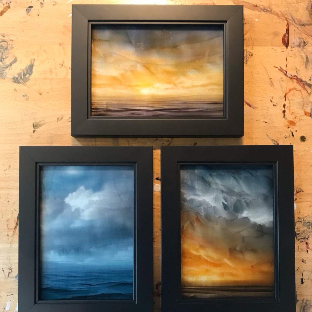I varnished and framed these small paintings. The lower right piece is off to Colorado.