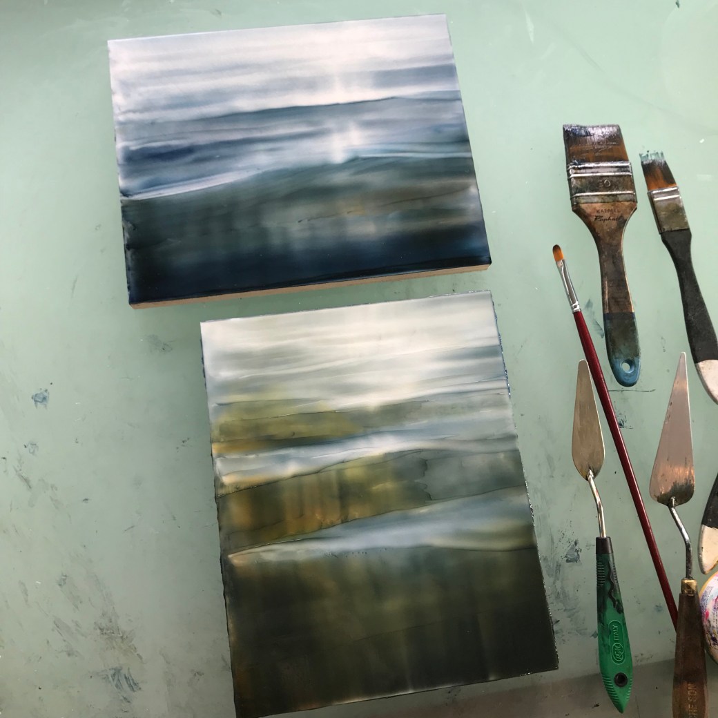 A couple small water studies, each 8″x10″. I always seem to come back to these meditative pieces.