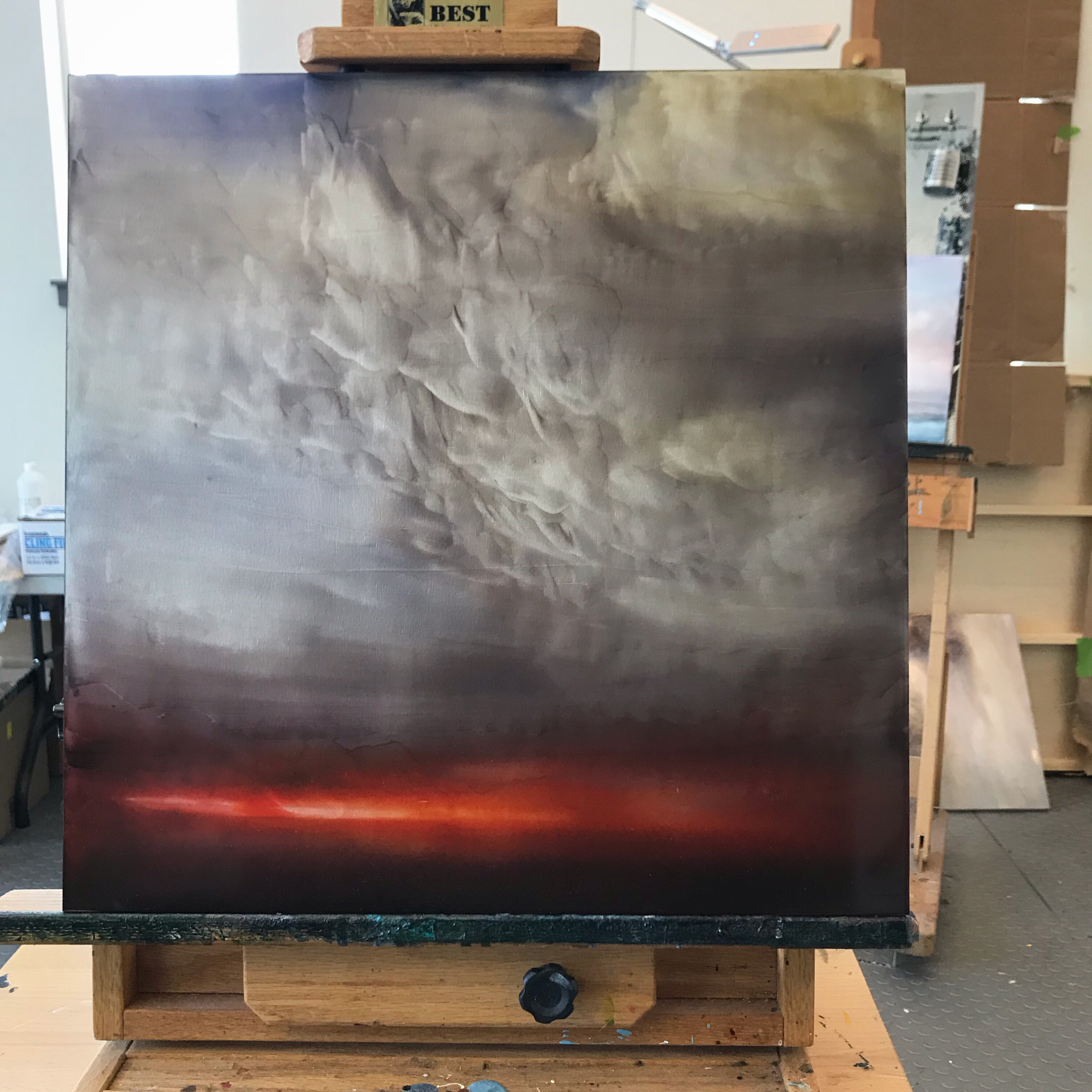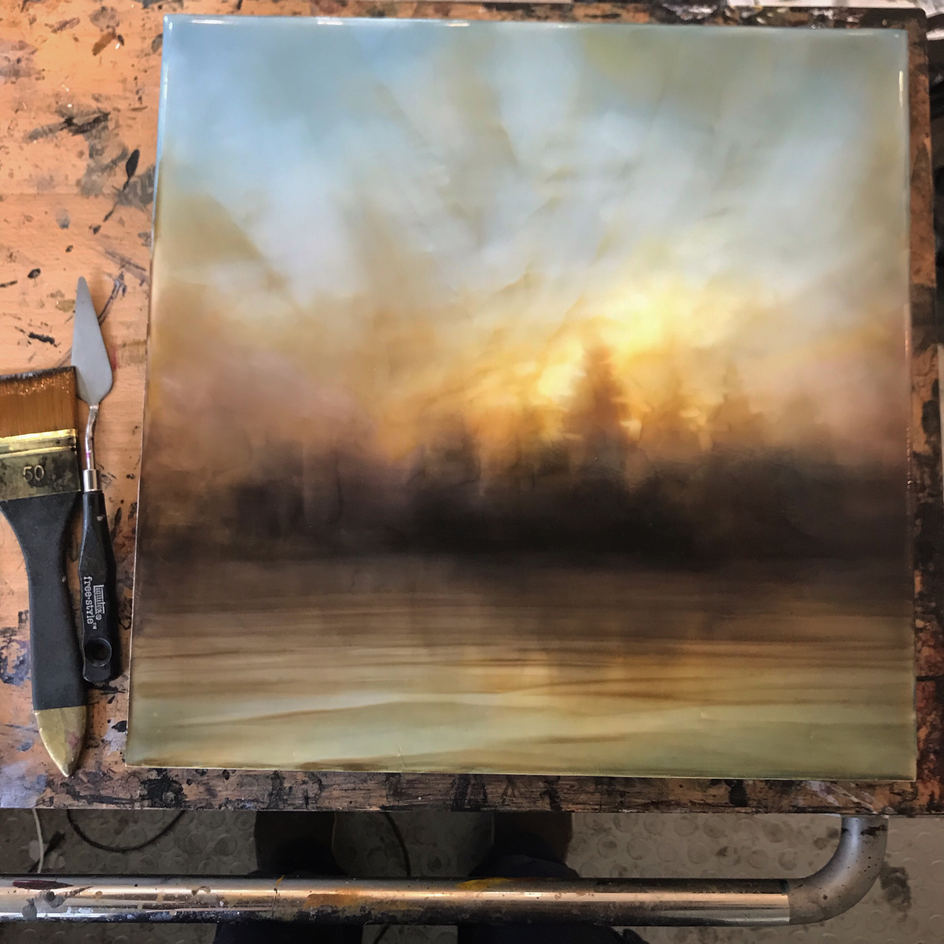 A dark and rainy morning as I add some layers of color to this piece. Painting with a crazy cold so I am a bit loopy. I’m not complaining.