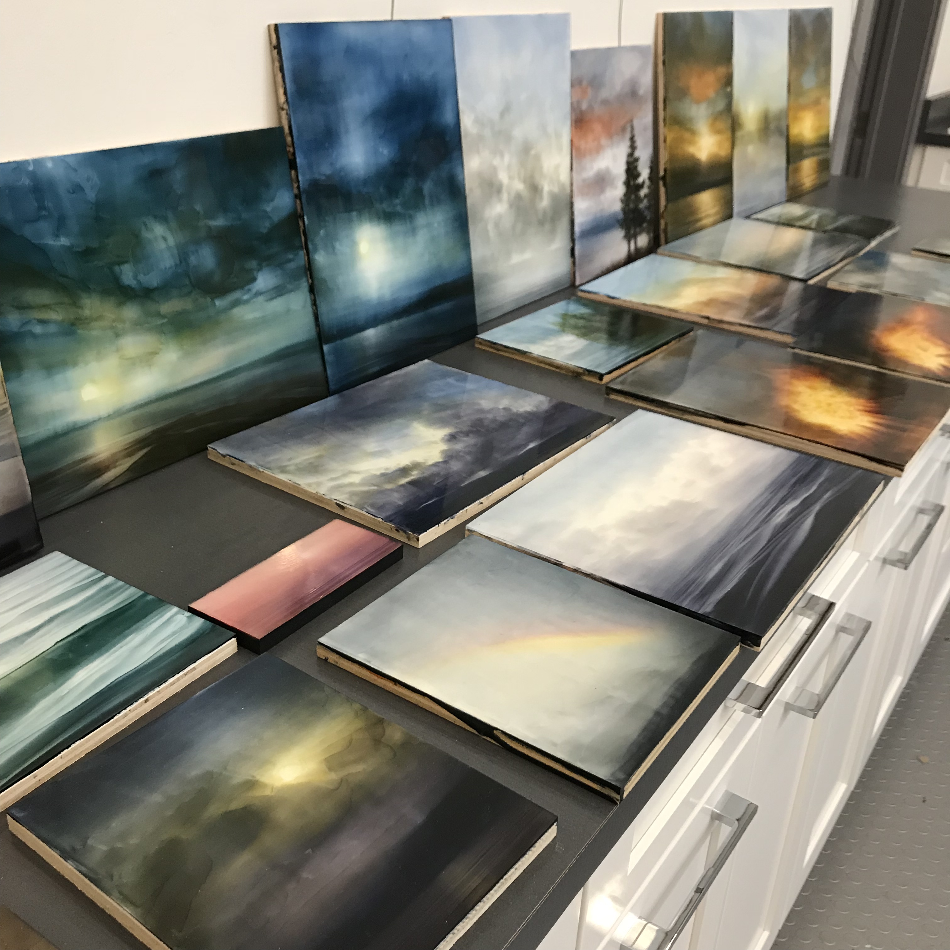 Here are some paintings on the counter this morning in my studio. I will packaging two of them up to mail out tomorrow! One is bound for Australia and one for Wisconsin.