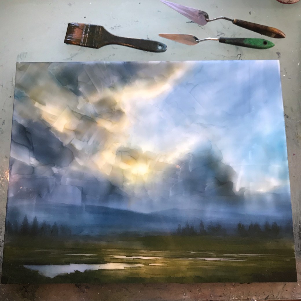 A colorful cloud painting on the studio counter with some friends! This one doesn’t have the apocalyptic vibe of yesterday’s post.