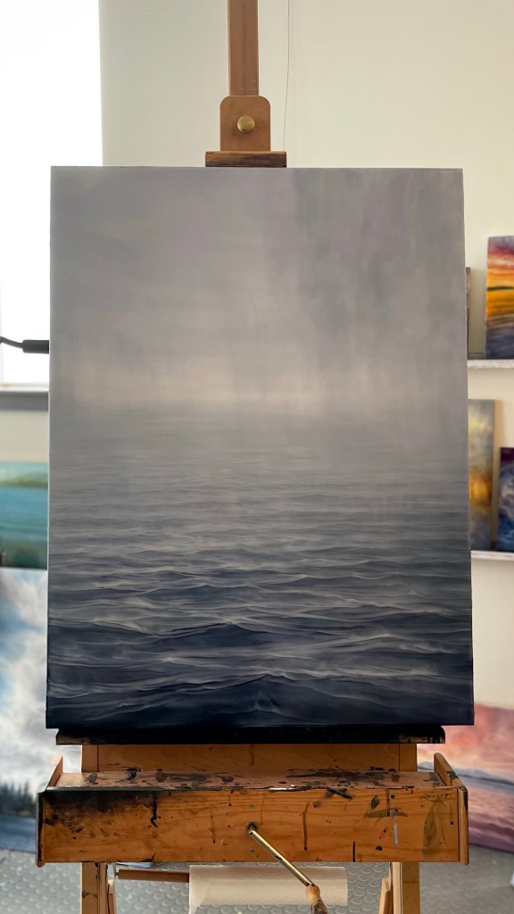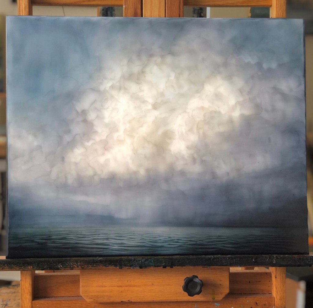 I love weather systems moving across the lake. Expansive daylight with sunshine ahead. This painting is bound for Momentum Gallery in Asheville, North Carolina.