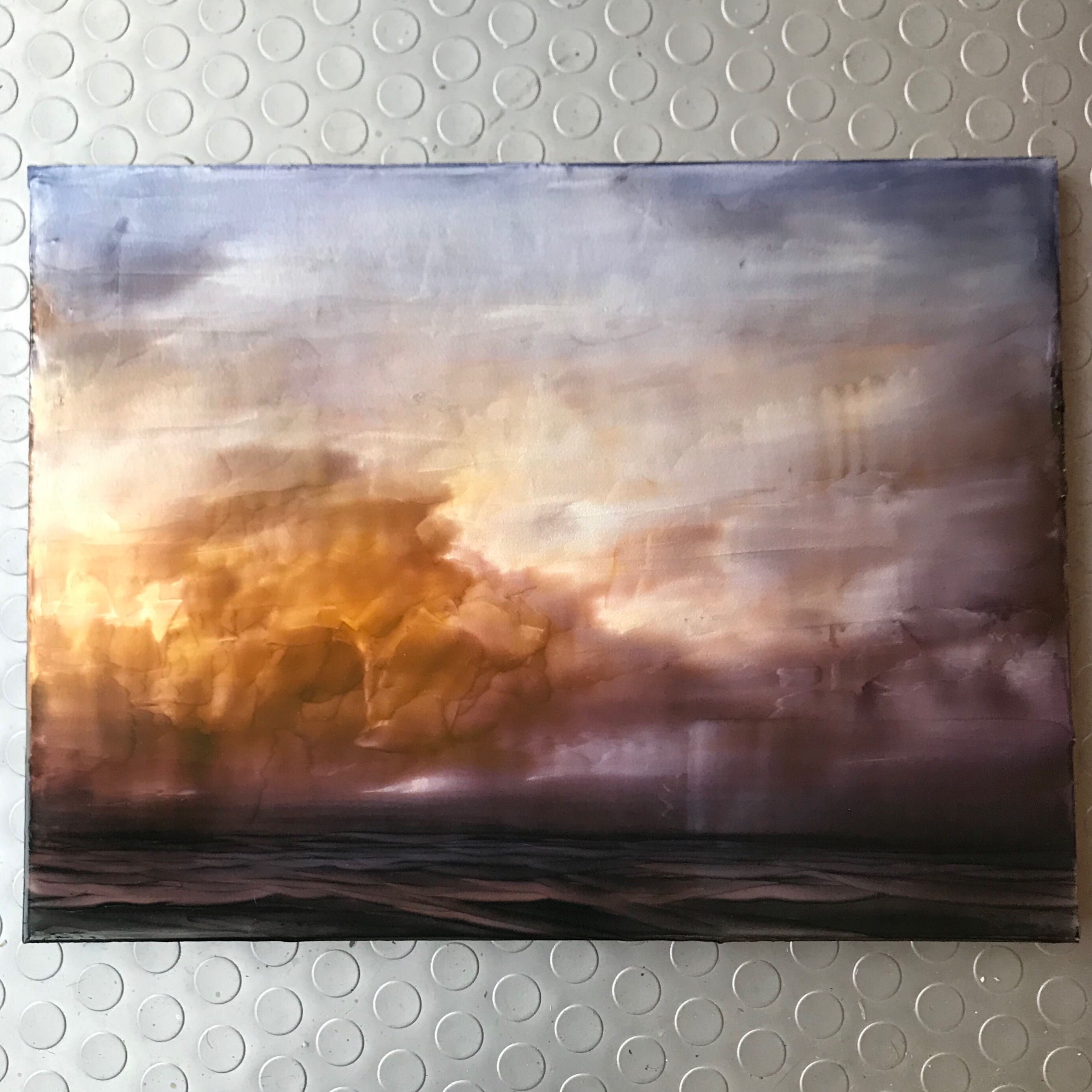 Two recent paintings on the studio table. Paintings are really piling up this year. I generally pick through older works and reuse the boards if I don’t think the paintings are up to my standards. These two will probably be kept.