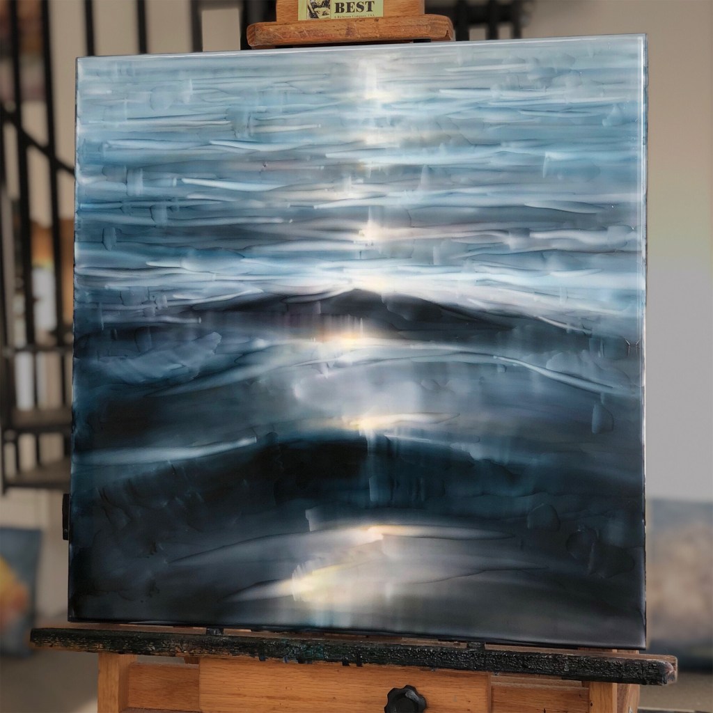 One of three square water panels I have been painting. Water is always a fascination and inspiration in my work. The simplicity and incredible complexity so mesmerizing. A mirror of the world.