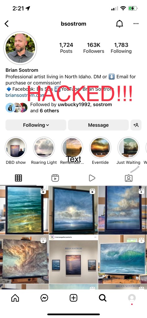 If you happen to follow me on Instagram, sorry for any nonsense there. My account was hacked and stolen. It has been my means of self promotion for 7 years, even though it is a frustrating platform.