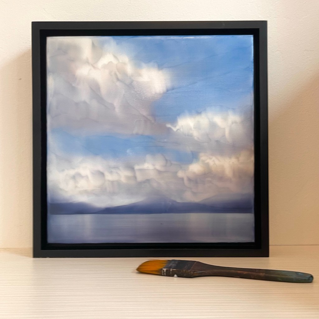 A square of weather and meditation. As a child I never ever painted on a square surface. I have grown to appreciate the format in my later days. Square is so void as to feel extra blank. Now I find myself enjoying the possibilities.