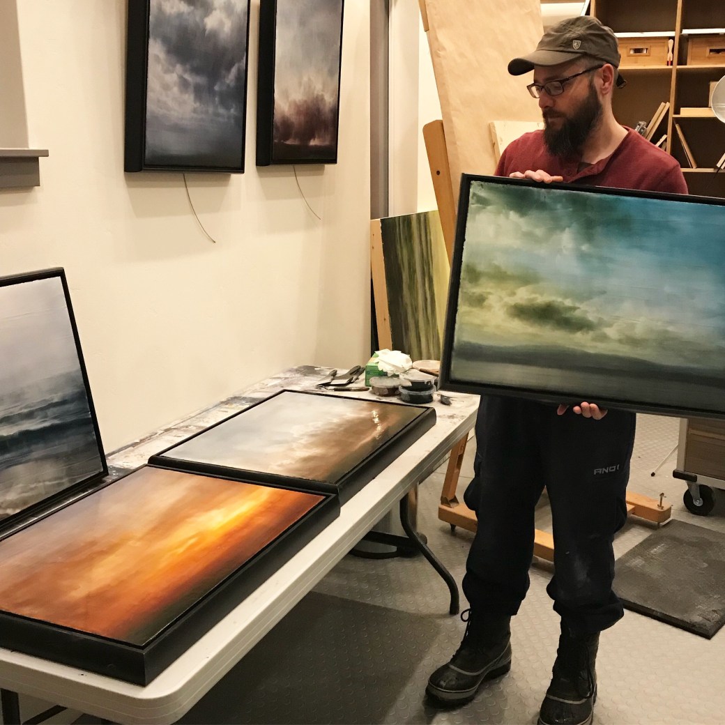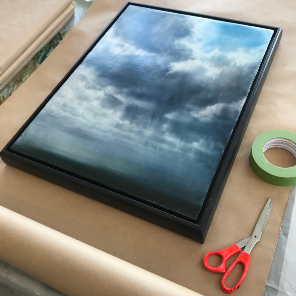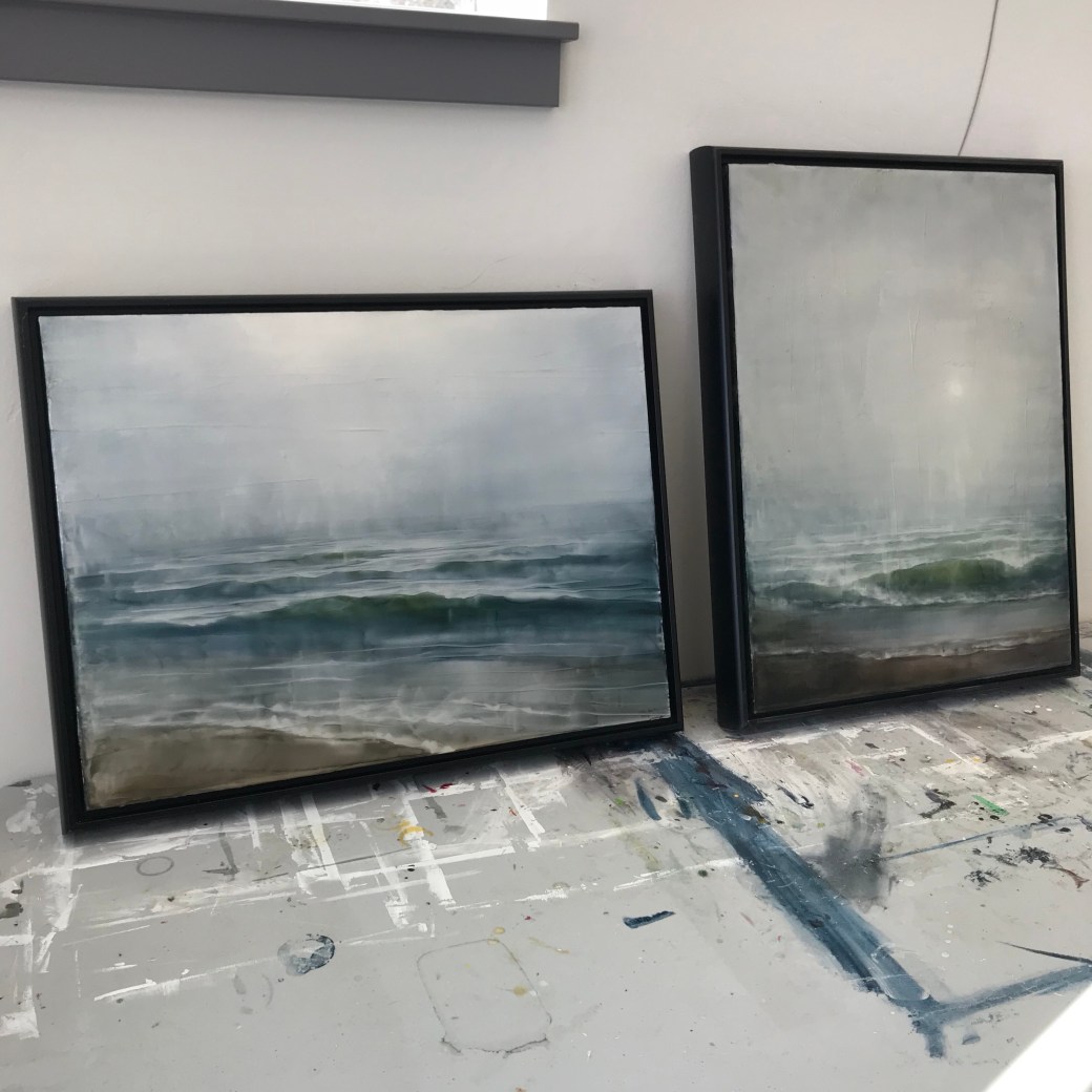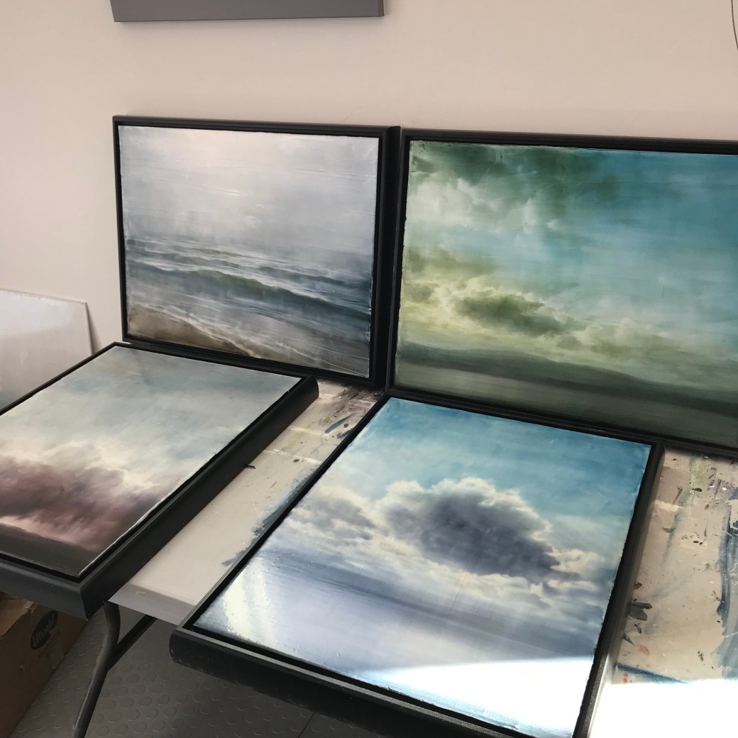 A couple paintings I have recently finished. I was commissioned to do three atmospheric water/sky paintings that are 7″x9″. It is a custom size so I had to cut a number of panels and decided to paint even more work that size! One of these was for the commission the painting beneath the text was just for me.