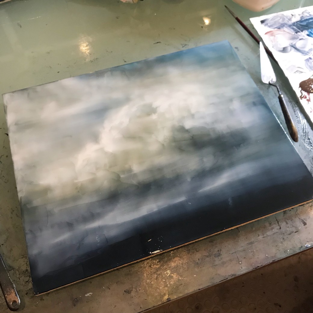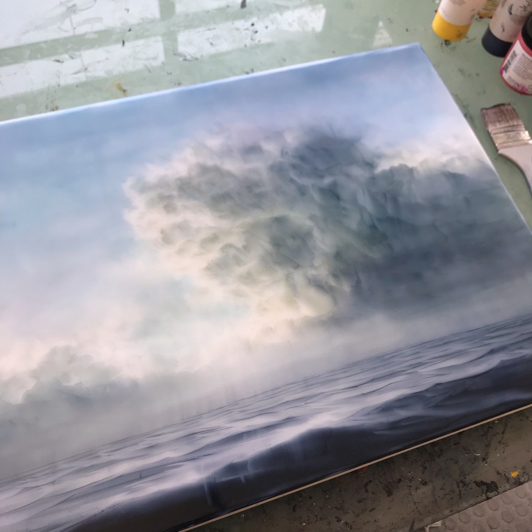 Another cloud painting inspired by the low winter sun of the north! Pictured in progress on my studio table.