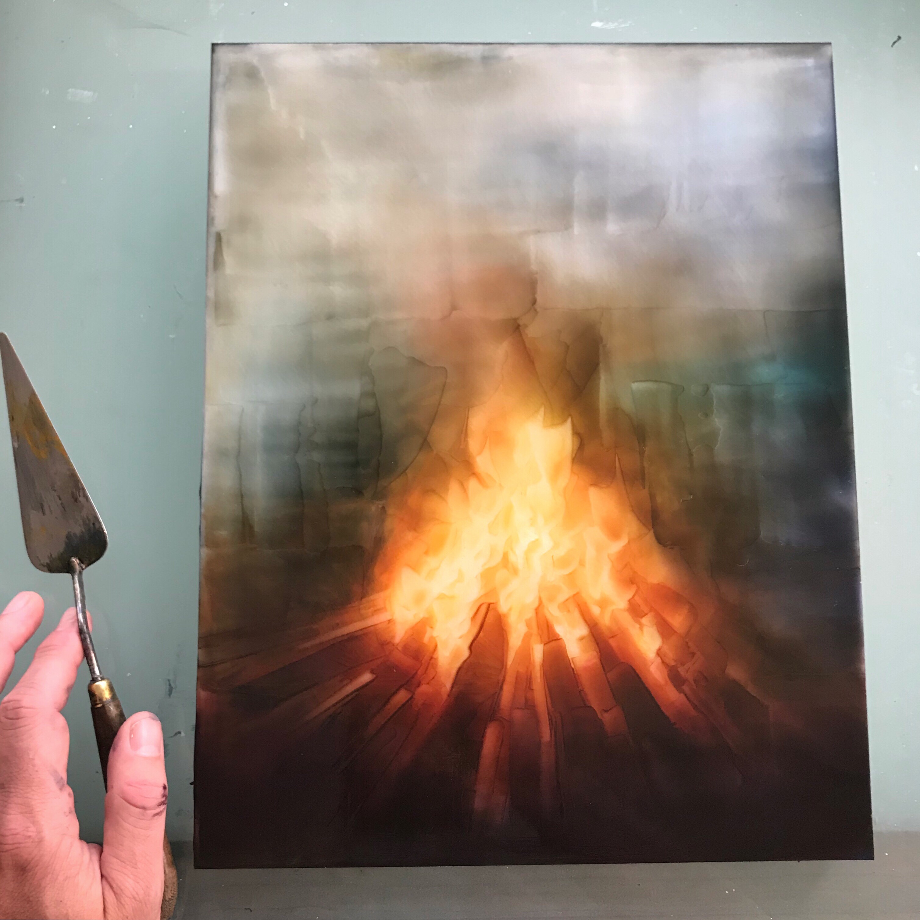 I have painted some small campfire paintings with the intention of eventually working on larger ones. Currently the largest boards I have prepped are 11″x14″ so I decided to paint some at that size. Just large enough to give me more freedom of movement!