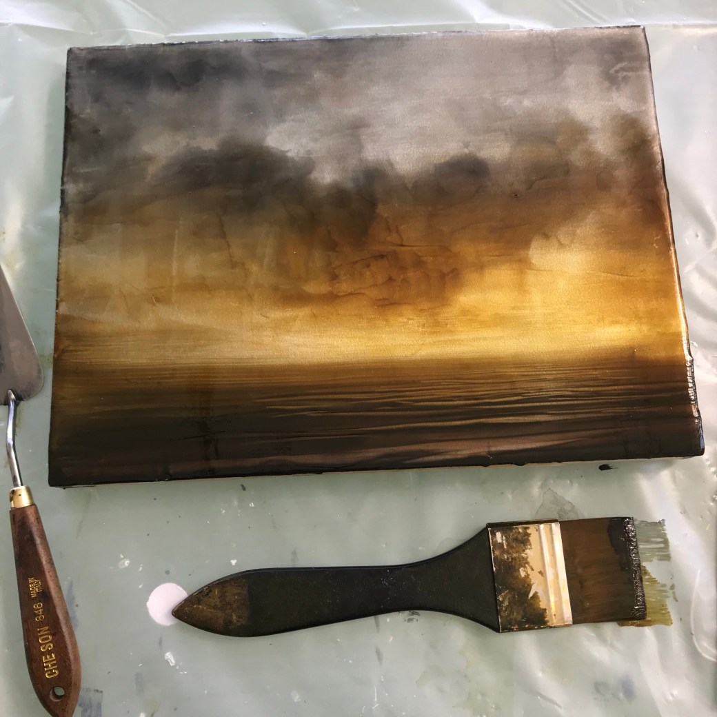 This is a 14″x11″ painting. I love to play around with the shifting forms of clouds and light. The behavior of the paint and the way it is manipulated is the star of the show here!