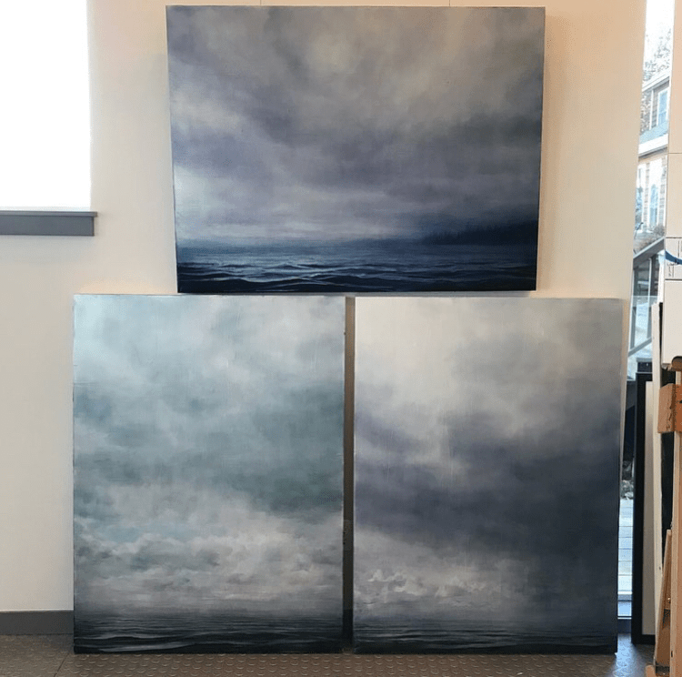 As the seasons change and the snow marches down the mountains I am seeing a lot more days like I represented in this painting. This one is 48”x36” painted on a 2” cradled board. I recently sold off a big painting so I had the perfect space available on my studio wall.